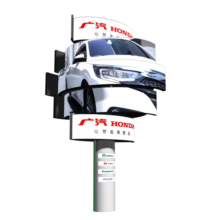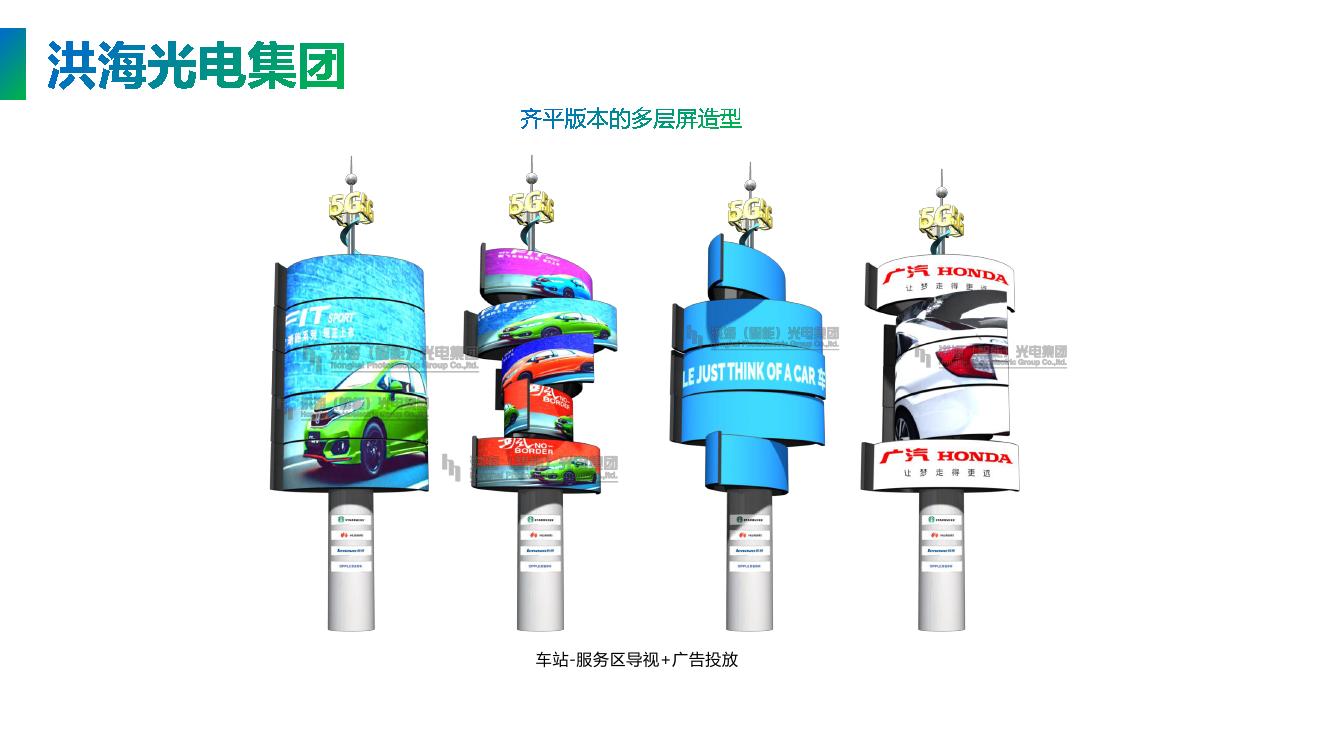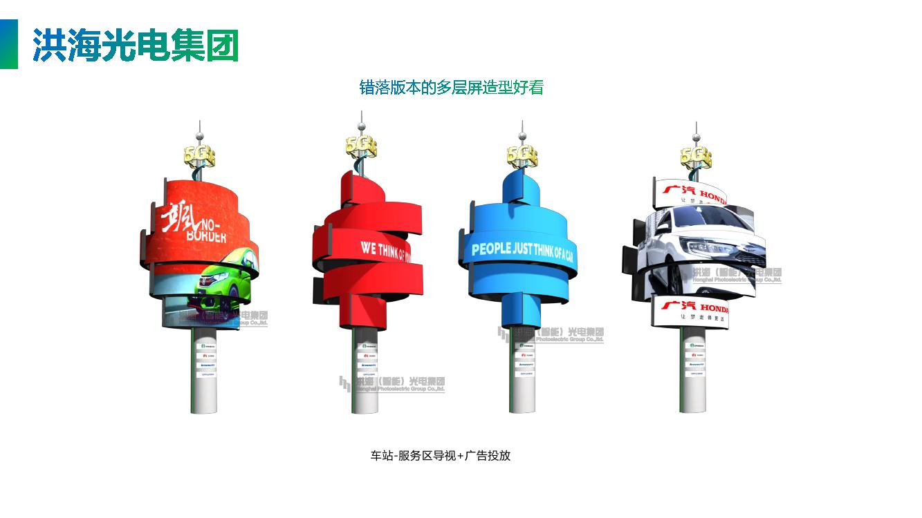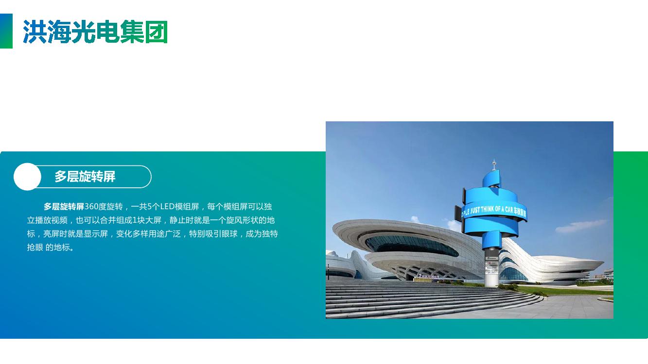 多層旋轉(zhuǎn)屏360度旋轉(zhuǎn),一共5個LED模組屏,每個模組屏可以獨立播放視頻,也可以合并組成1塊大屏,靜止時就是一個旋風(fēng)形狀的地標(biāo),亮屏?xí)r就是顯示屏,變化多樣用途廣泛,特別吸引眼球,成為獨特?fù)屟鄣牡貥?biāo)。